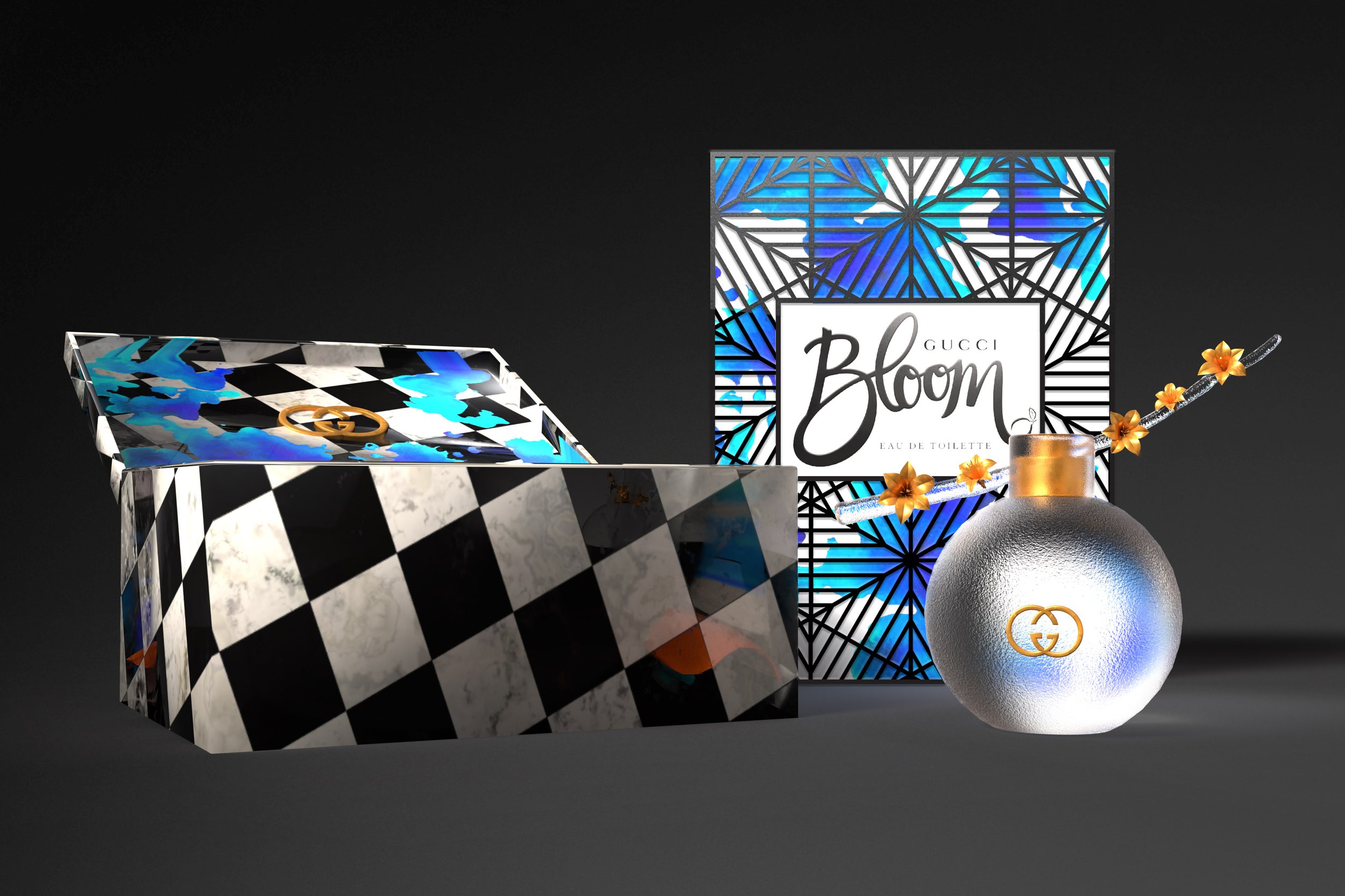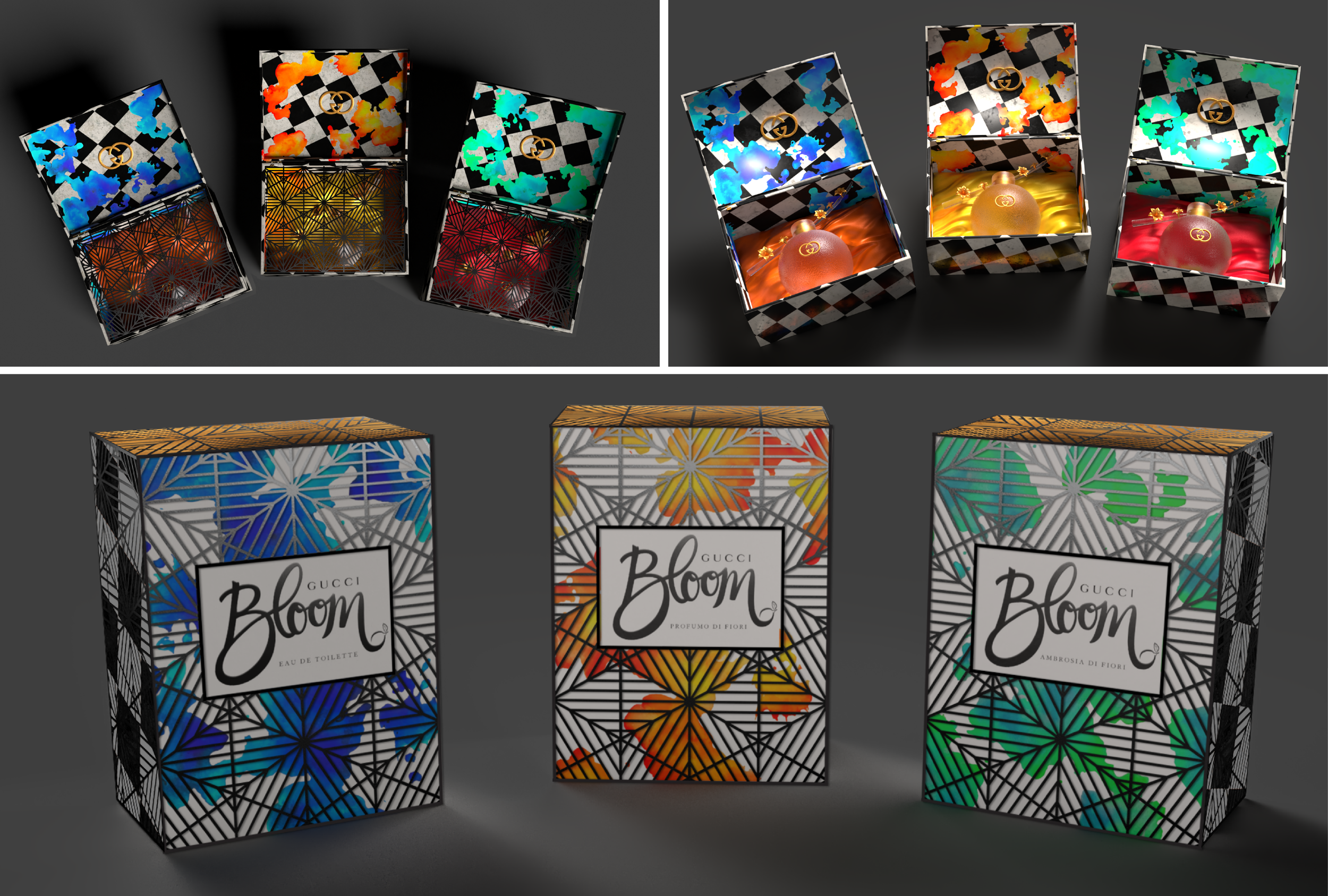 This conceptual luxury packaging design for Gucci Bloom perfume draws inspiration from surrealist art to create an experience that is both elegant and whimsical. The outer packaging features a custom watercolor design, created from scanned watercolor paintings, overlaid with a black laser-cut metal layer that slides off, which adds texture and depth. Each of the three scents is distinguished by its own watercolor hue—blue for the main scent, with green and yellow-orange for the other two. Gold leaf accents adorn the top and bottom packaging panels, enhancing the luxurious feel. A custom logo integrates Gucci’s existing wordmark with a custom typeface for the word “Bloom.”